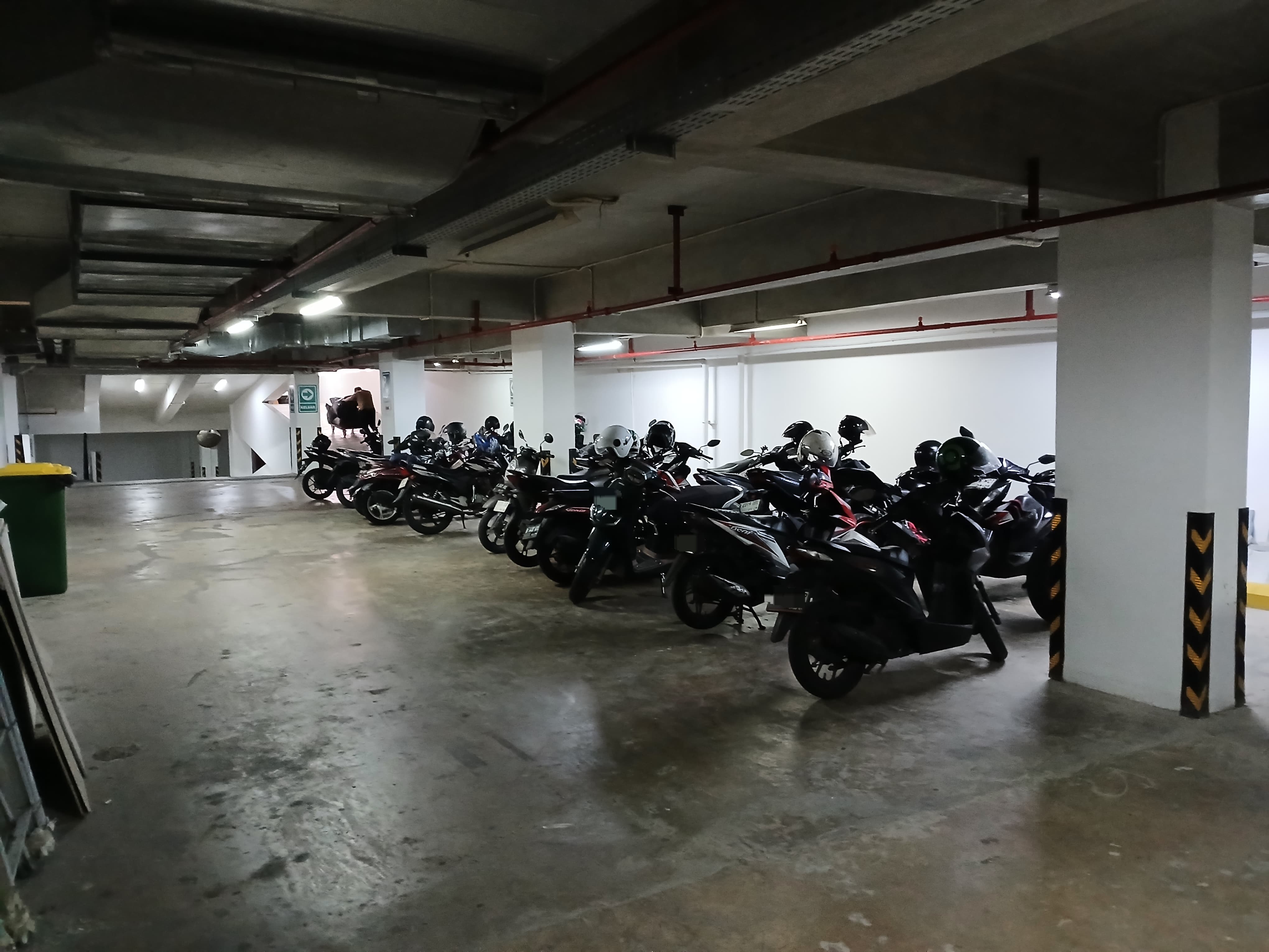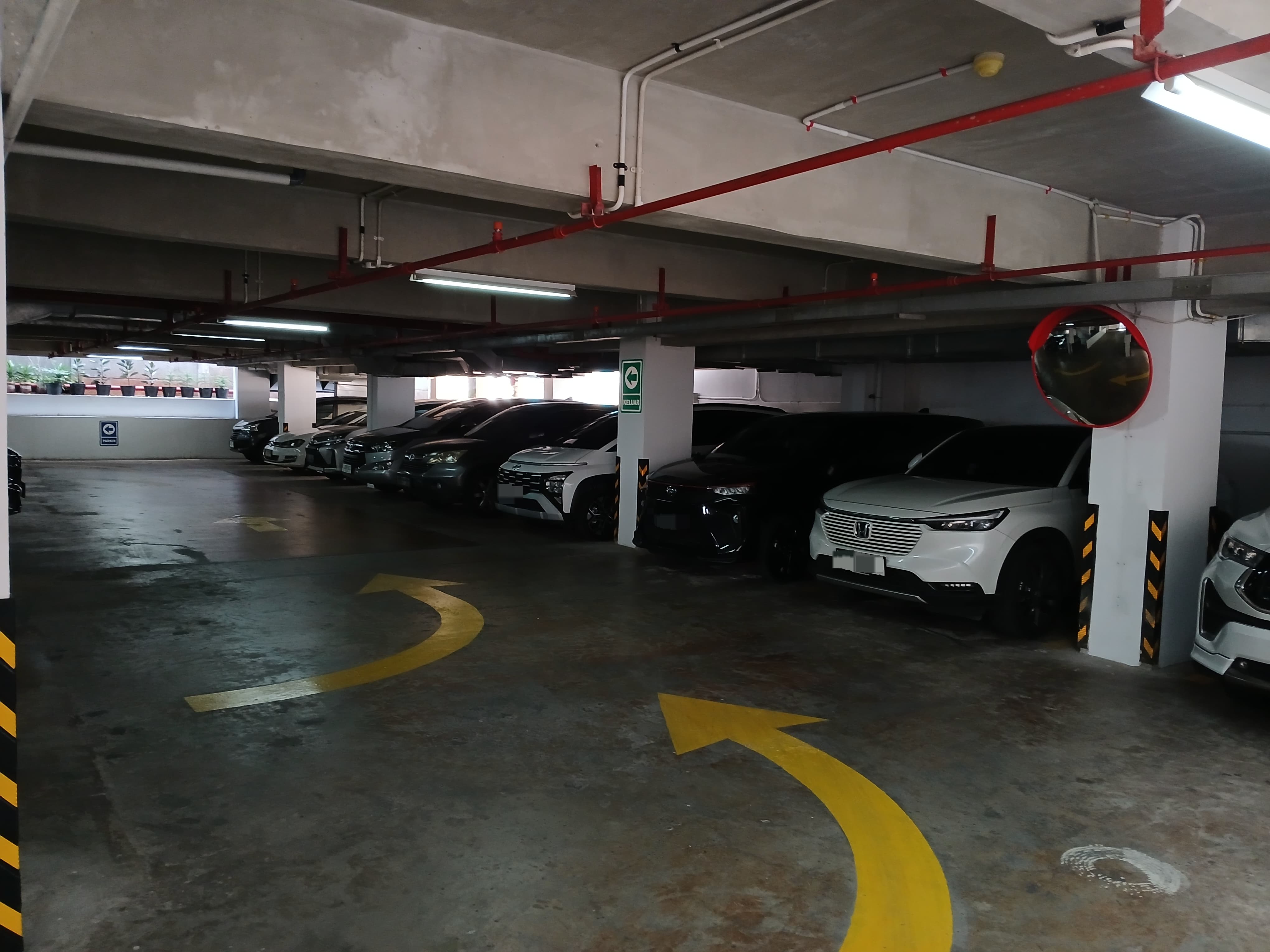 The parking lot was built with a mixture of cement and strong beams, providing a safe and convenient parking space for various types of vehicles.